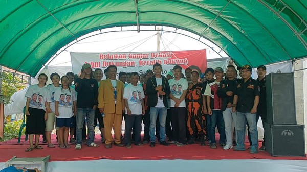 Jakarta – Ada relawan pendukung pasangan calon presiden nomor urut 3 Ganjar Pranowo-Mahfud Md di Kabupaten Bekasi,...