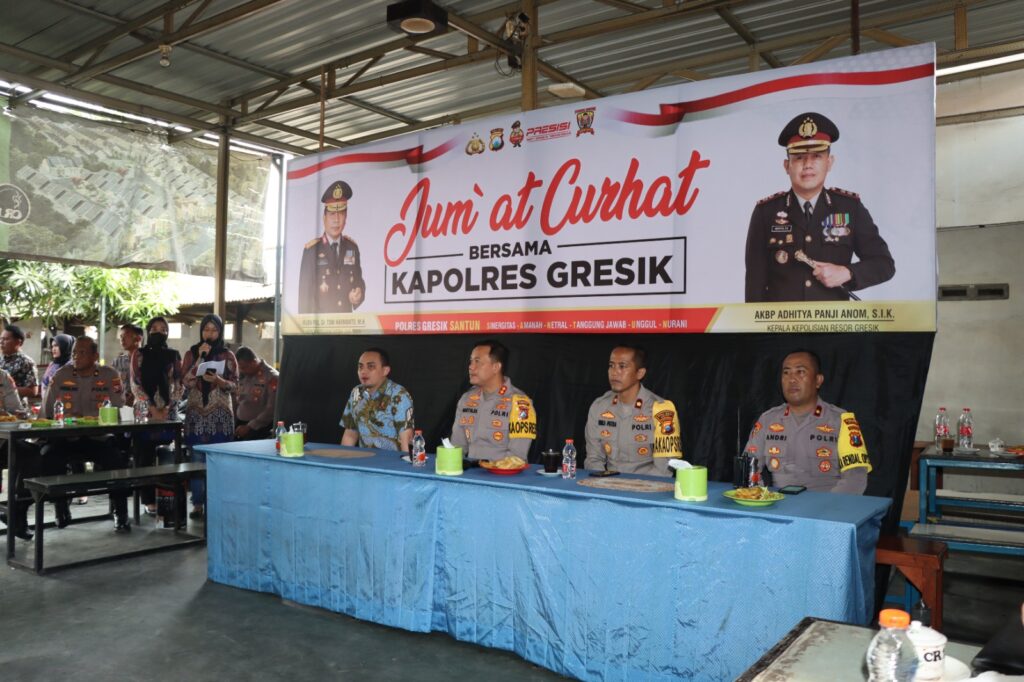 GRESIK – Sebagai bentuk pelayanan prima Kepolisian, Kapolres Gresik AKBP Adhitya Panji Anom mengadakan Program Jumat Curhat yang bertujuan untuk menampung usul maupun saran terkait situasi kamtibmas yang kondusif bersama perangkat desa Kecamatan Manyar yang digelar di warung cak R1 di jalan Tridarma Kecamatan Kebomas, kabupaten Gresik.