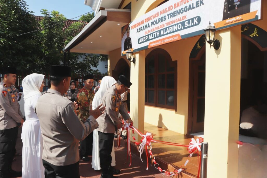 Trenggalek – Kepala Kepolisian Resor Trenggalek AKBP Alith Alarino, S.I.K. meresmikan Masjid Baitul Muttaqin yang berada di area Asrama Polisi (Aspol) Polres Trenggalek yang baru saja selesai direnovasi. Peresmian ditandai dengan pemotongan pita dan penandatanganan prasasti oleh Kapolres disaksikan sejumlah pejabat utama. Rabu, (22/2).