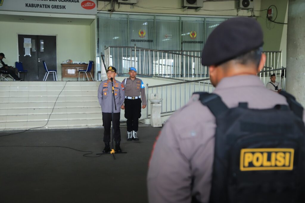 Dalam apel Pengamanan pertandingan Sepak bola BRI Liga 1 antara Persebaya Surabaya VS PSM Makasar yang dipimpin Kapolres Gresik AKBP Adhiya Panji Anom