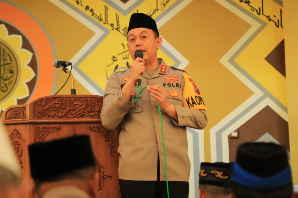 Selain memberi pesan Kamtibmas, Kapolres memberikan bingkisan kepada takmir masjid Asy Syafa’ah.