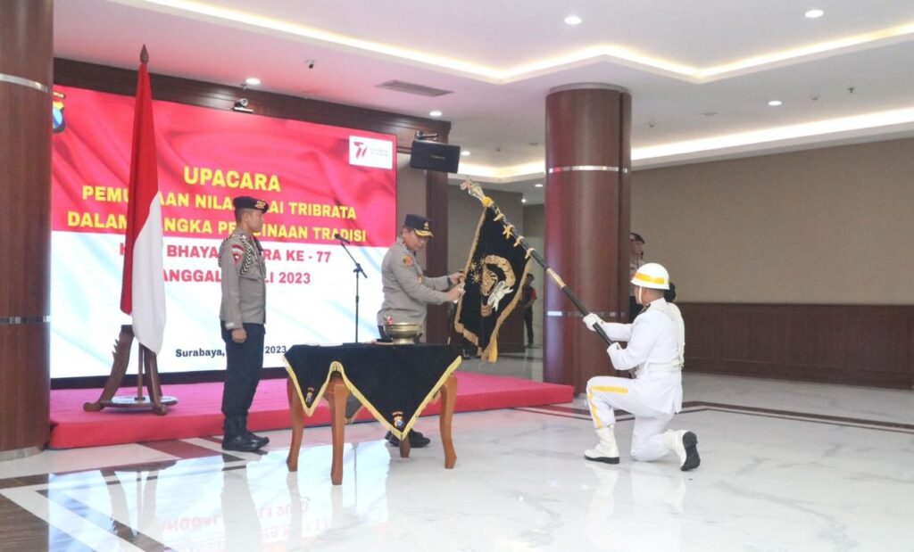 SURABAYA – Kapolda Jawa Timur Irjen Pol Dr Toni Harmanto,M.H memimpin upacara pemuliaan nilai nilai luhur Tribrata, Pataka Polda Jatim “Tan Hana Dharma Mangrwa di Lantai 2 Gedung Patuh Mapolda Jatim,Rabu (21/6/2023).