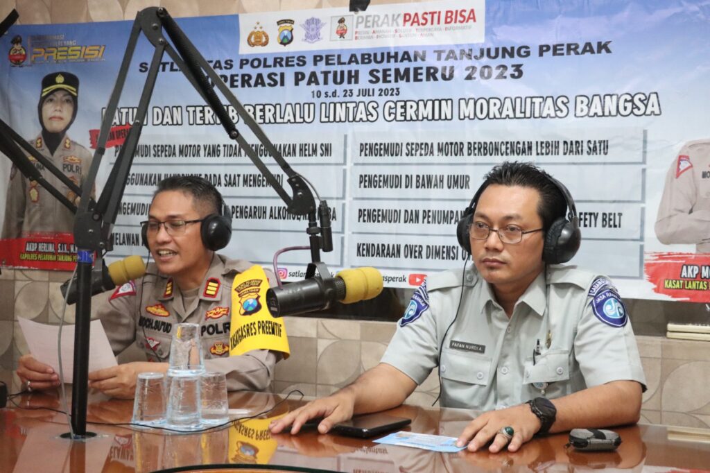 Guna menyukseskan pelaksanaan Operasi Patuh Semeru 2023, Kasatlantas Polres Pelabuhan Tanjuk Perak AKP Moch Su’ud bersama personil satgas ops melakukan sosialisasi via siaran radio Wijaya FM, Selasa (11/7) siang.