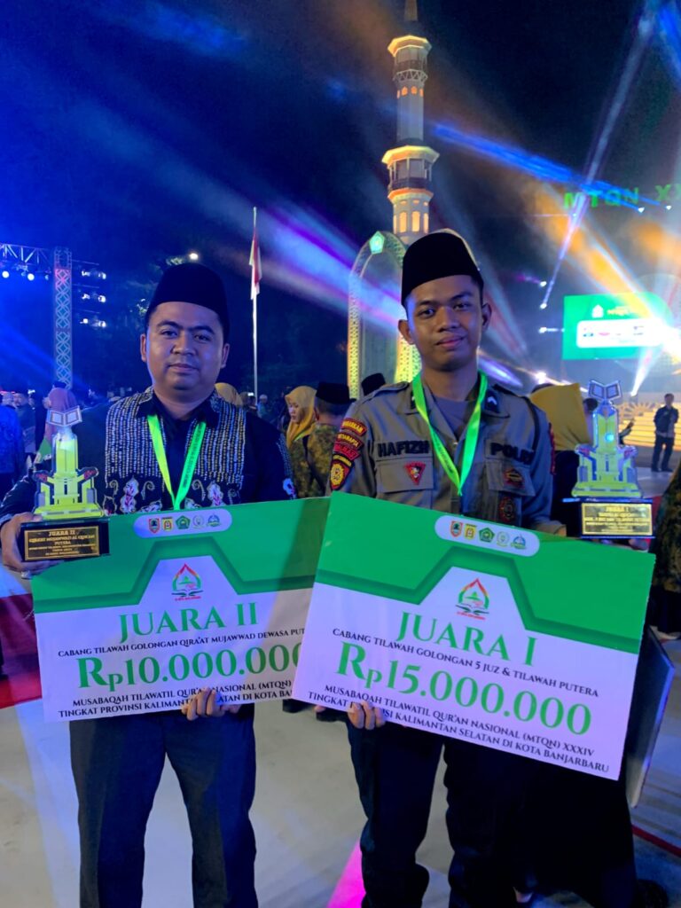 Bripda M Hafidz dari Direktorat Samapta Polda Kalsel menjadi Juara 1 Cabang Hafidz Tilawah 5 Juz. Sementara Bripda Muhammad Ahlun Nazhar dari Polres Hulu Sungai Utara (HSU), menyabet Juara 2 Cabang Lomba Qira’at Mujawwad Dewasa.