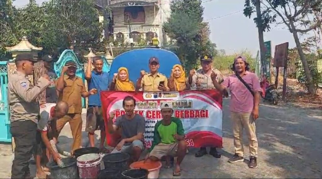 GRESIK – Polres Gresik Polsek Cerme Kabupaten Gresik, melaksanakan bakti sosial pembagian air bersih kepada warga terdampak kemarau panjang. Sebanyak 10 ribu liter air bersih dikirim ke Desa Kambingan dan Desa Dungus, Kecamatan Cerme, Kabupaten Gresik.