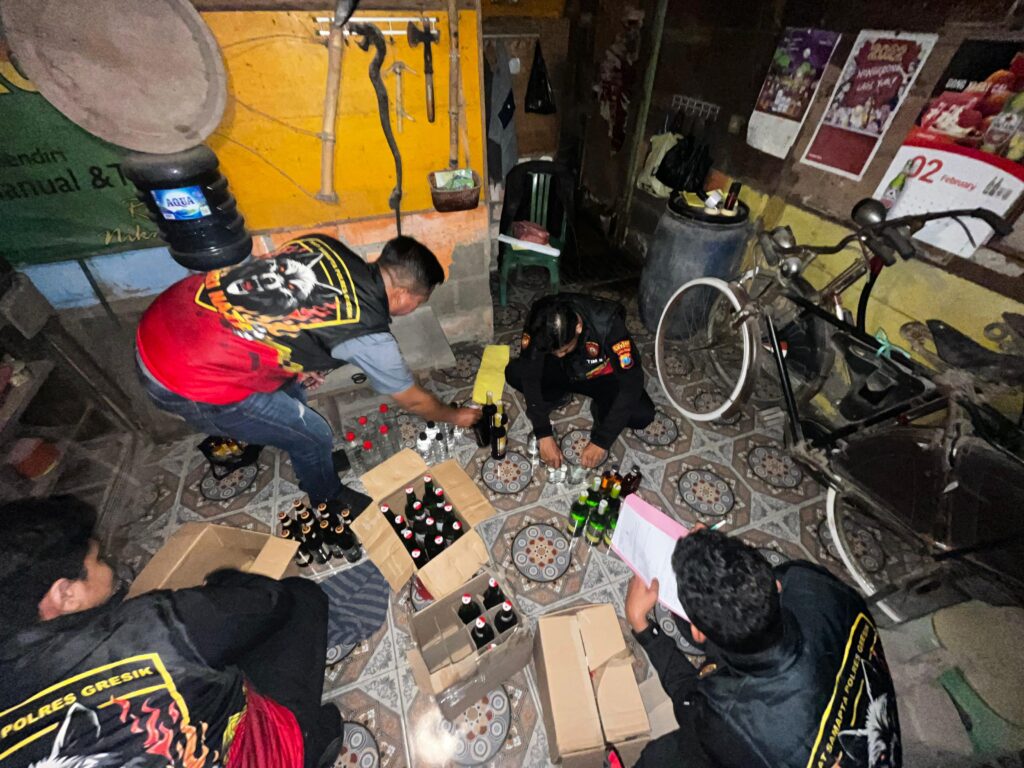 GRESIK – Unit Patroli dan Pengawalan (Turjawali) Satuan Samapta Polres Gresik kembali melakukan penertiban terhadap peredaran minuman keras (miras) di wilayah Kabupaten Gresik. Dalam operasi yang digelar pada Kamis malam, 27 November 2025 sekitar pukul 22.00 WIB, petugas berhasil mengamankan dua terduga penjual miras serta menyita puluhan botol berbagai jenis sebagai barang bukti.