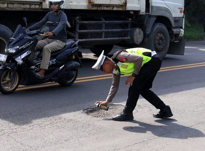 Jelang Nataru, Polres Gresik Tandai Jalan Berlubang di Raya Deandles Demi Keselamatan Pengendara
